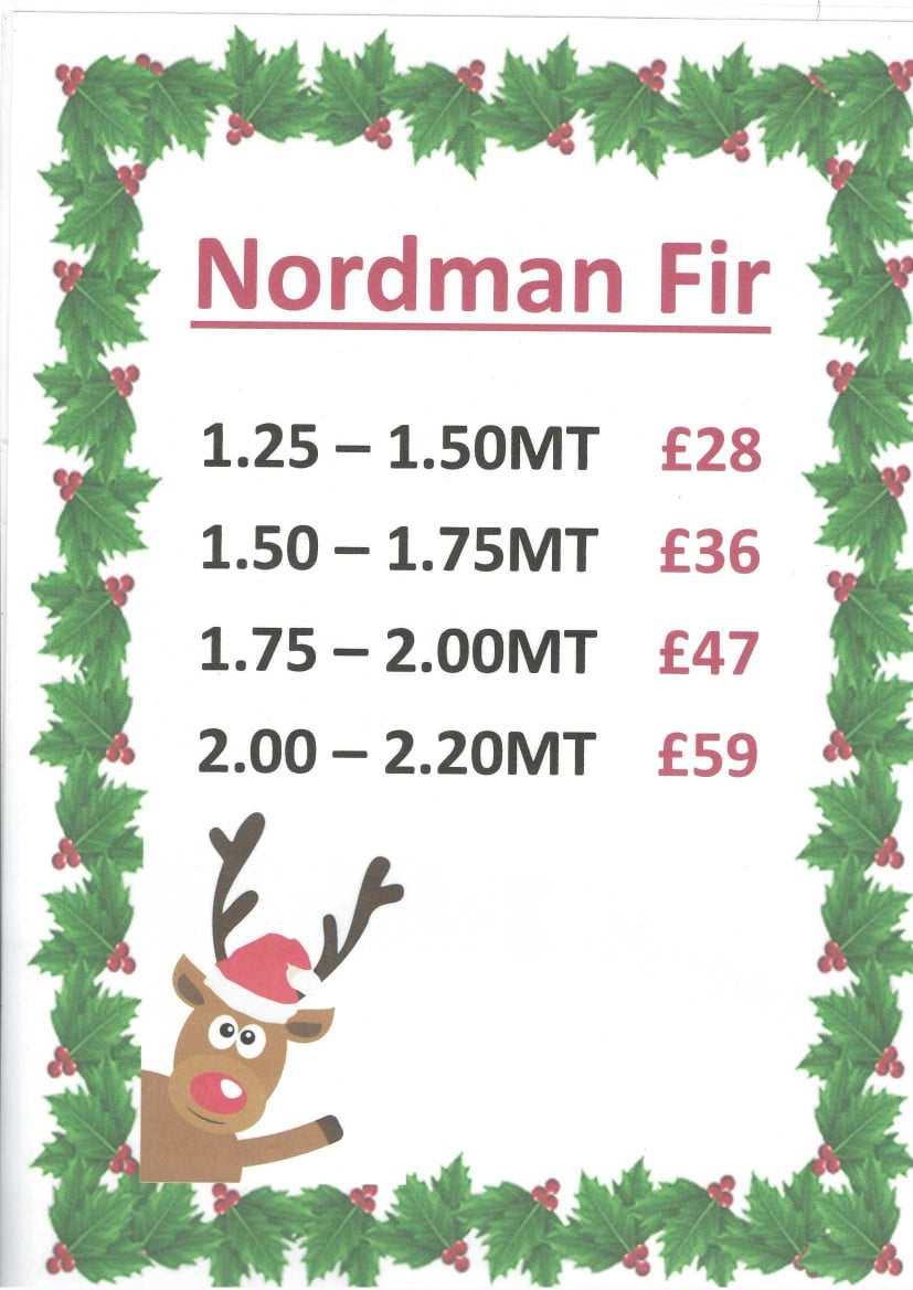 We will be stocking the traditional Norwegian Spruce variety, and the Nordman Fir, which doesn’t drop its needles. For more information on the differences between the two, follow this link. Heights and prices are pictured below.
