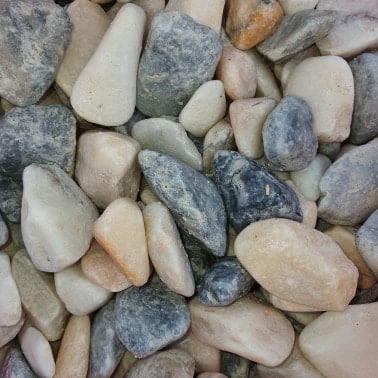Flamingo Pebbles are a tumbled stone that is a mix of creams, pinks, and light grey, all of which contain a natural sparkle. This is an eye-catching product that works well as a contrast to darker materials. These pebbles also make a perfect top dressing for pots and planters.